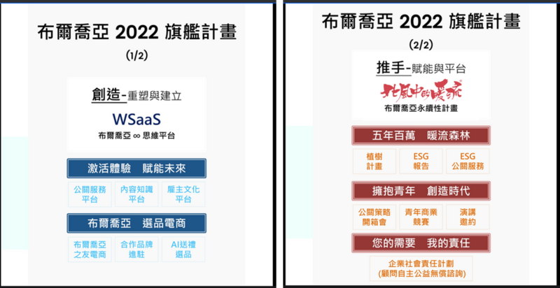 因應【EPISODE IV:成為新時代的造局者】新旗幟,我也很高興地與各位報告,已經與我們一起奮鬥八年的張晏慈小姐,在她自己的爭取與陶成下,轉任為我們的人力資本發展經理,從提升內外夥伴的滿意度開始,與我以及她的團隊一起建立符合未來的組織樣貌;另外,我們一位優秀的約聘小夥伴,在她從東吳企管畢業前便與我們簽約,從正職出發,與其主管一起負責我們最耗心力的【北風中的暖流】(布爾喬亞ESG項目),從經營公關青年人社群為核心、擴散至內部營運提升、涉外ESG合作等。
