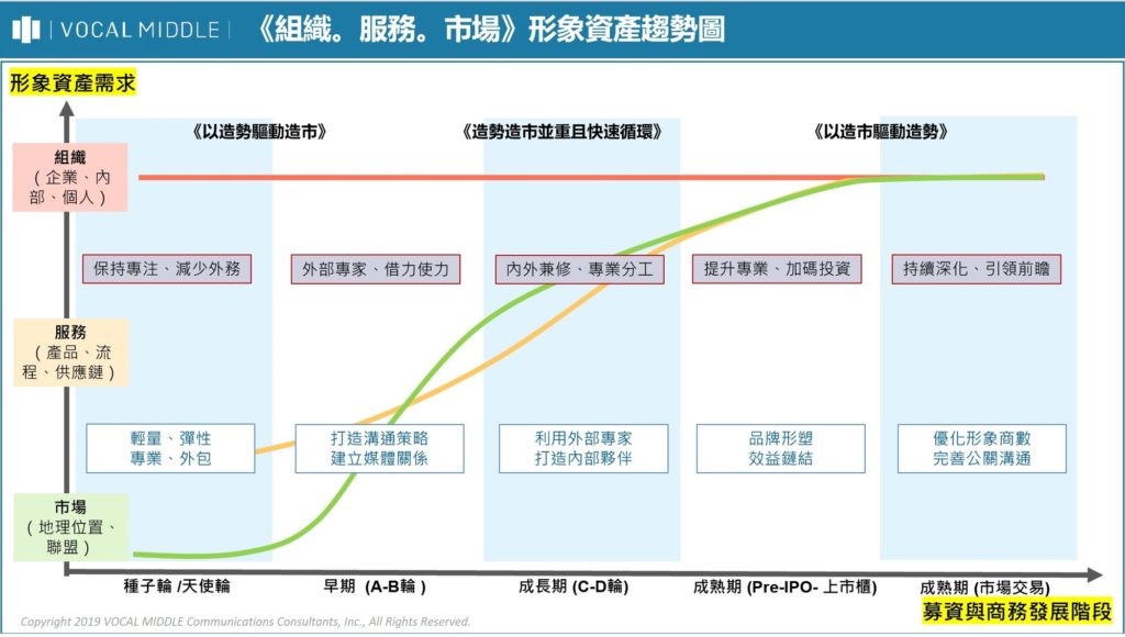 成熟期策略夥伴:邁入成熟期階段的團隊,則要開始思考未來攻克市場的版圖與型態,依照產業屬性、是否建立海外市場、各種聯盟型態(打群架),都有完全不同的溝通策略與操作手法。此時,前期投資耕耘形象資產的團隊,開始能收其效益鏈結,包含:清晰的品牌識別,精準的資訊傳遞、共同的企業理念,再以此為基礎形成強而有力的資訊流循環。透過有效的「造市」策略與解決方案,堆疊並深化「品牌形象資產」,形成後進不易跨越的品牌護城河壁壘,並完善整體企業公關溝通。