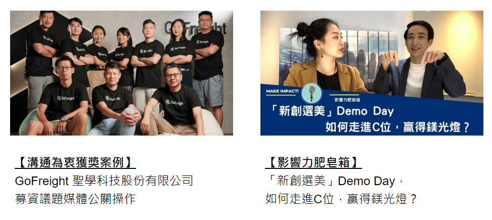 GoFreight 進行A輪的募資,多間矽谷創投領投,最終達到超過七億台幣的募資金額,創下台灣史上SaaS募資金額的新里程碑。然而 GoFreight B2B 的商業模式,不容易凸顯品牌差異化與認知,因此本專案目標為借重募資里程碑創造市場聲勢,建立品牌形象識別。- 【影響力肥皂箱】「新創選美」Demo Day,如何走進C位,贏得鎂光燈?