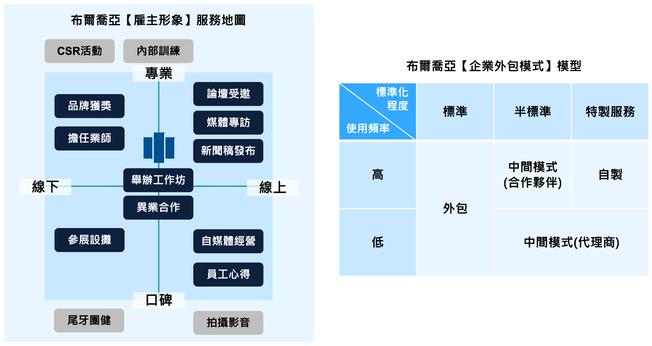 因此針對以「員工」為關鍵利益關係人的溝通策略,布爾喬亞收集常見公關顧問服務,盤點出從專業到口碑、線上到線下的【雇主形象】服務地圖,並在與客戶洽談時,搭配【企業外包模式】模型,盤點出其專屬的關鍵項目與合作模式。
