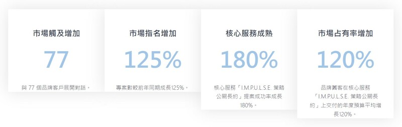 在 2019 上半年專注招募優秀的「顧問大軍」做堅實的後盾,下半年的課題則是如何讓市場買單。自從推出「I.M.P.U.L.S.E. 策略優先方法論」後,顧問逐步在與客戶對談的會議中、在專案的實戰效益檢視後獲得驗證,越來越多公關經理人對此關注,主動洽詢、釋出合作機會。