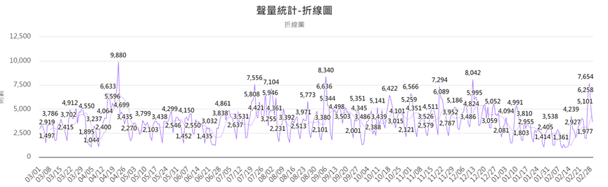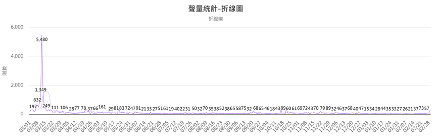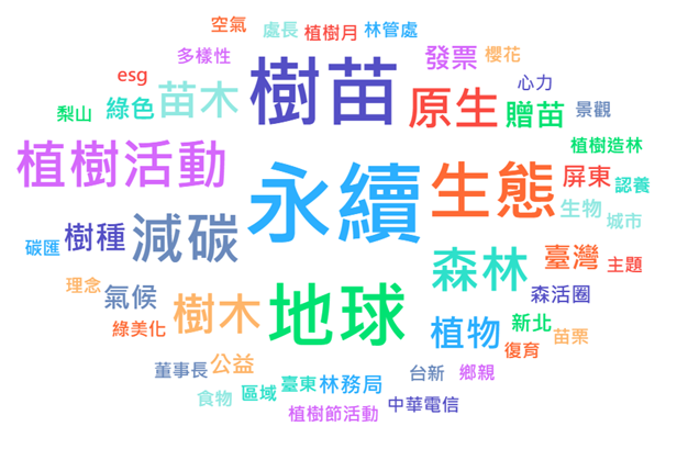 在文字雲中顯示重點關鍵字以單位或地點、永續綠色減碳等資訊為主要;聲量部分則是在植樹節3/12前後有明顯高峰與討論度。