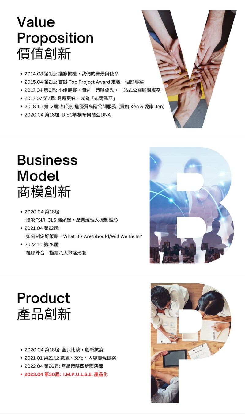 Workshop的開場,帶著全體夥伴一窺一路走來的脈絡,以及我們將如何成為「新時代的造局者」。第1屆的主題從願景與使命開始,建立我們的「價值創新」,談何謂好的服務與專案、談「布爾喬亞是誰」,凝聚具有相同目標與信念的夥伴,積極讓市場認識布爾喬亞公關顧問。而後,開始形塑我們的服務、我們的商模、我們的機會,開始面對市場,建立「產業經理人」的雛型,訂定服務與進攻的發展策略,談起「商模創新」,更看向未來正開始要建立的「產品創新」:數據、文化、內容如何變現?產品的Business Model Canvas怎麼寫?