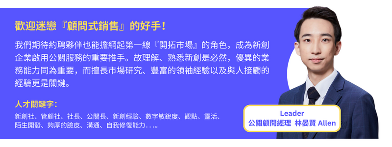 ➡新創產業|Leader:公關顧問經理 Allen ( 顧問簡介 ) 需求人數:2-3位