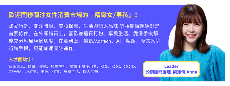 ➡中大型企業(女性消費市場)|Leader:公關顧問副理 Anna ( 顧問簡介 ) 需求人數:4-5位