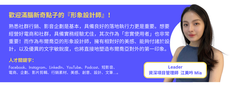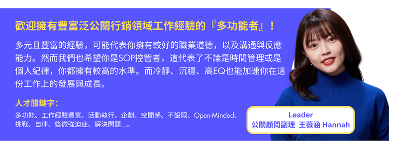 ➡中大型企業(跨產業領域)|Leader:公關顧問副理 Hannah ( 顧問簡介 ) 需求人數:4-5位