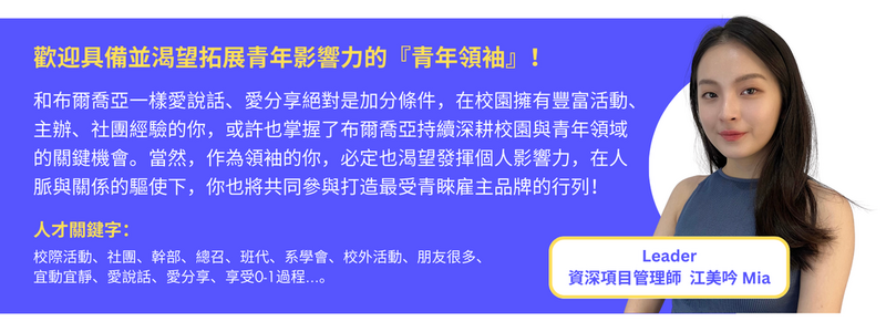 在學期間以「 約聘企業形象顧問」身分加入布爾喬亞。主責布爾喬亞ESG計畫下,以「青年永續」為核心之「青年永續發展計畫」。到職至今,主辦約20場專為在學青年設計的「公關策略開箱會」、投入數十場校招活動與校園講師合作,持續為青年帶入產業與職場的正確觀念,亦是組織雇主品牌經營與人才養成與發展的幕後推手。為持續鏈結企業資源賦能青年人才,自布爾喬亞第二個十年的Day1起,我們即要組建強勁團隊,持續打造最受青睞的雇主品牌!