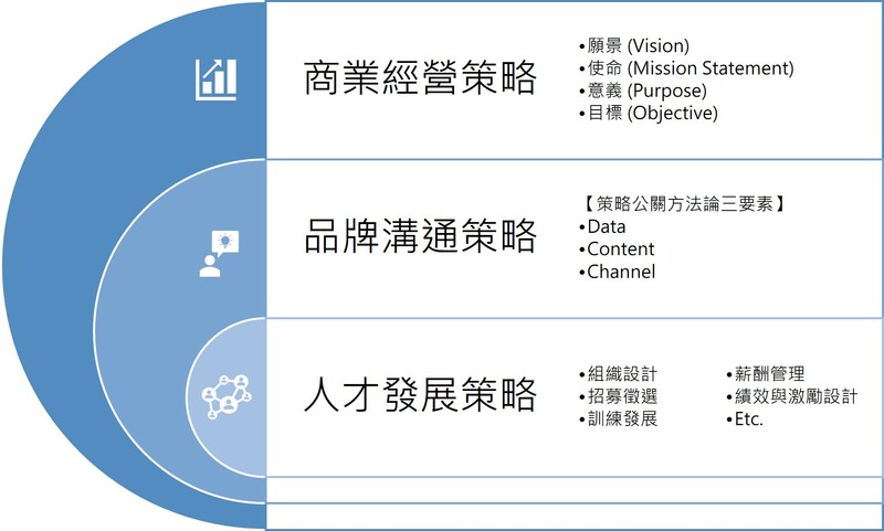 我們不談學理,只從實際經營的角度來看,我們檢驗的就是公司願景(Vision)、使命(Mission Statement)、意義(Purpose)、目標(Objective),是否充分地貫穿、反映在對內、對外地描述上。這個「一致性」是企業形象有沒有說服力的關鍵。不論是人資或品牌公關,所有雇主形象的相關言行,都應該貼合公司的經營,才能達到【商業經營策略】、【品牌溝通策略】、【人才發展策略】三位一體的影響力。