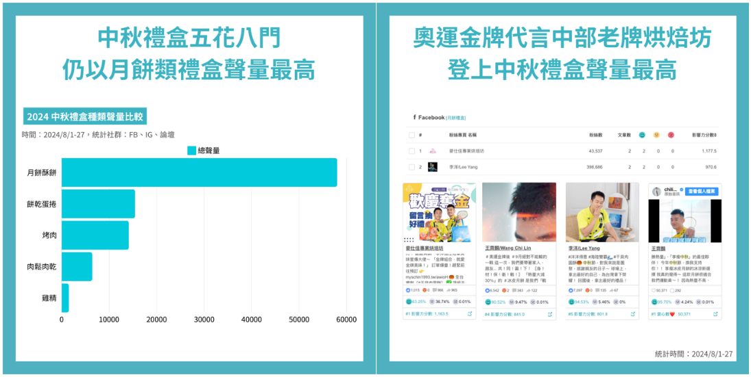 更多聲量排行,歡迎參閱:【中秋禮盒聲量分析】奧運金牌代言禮盒成黑馬,彰化林記糕餅影響力緊追不二坊