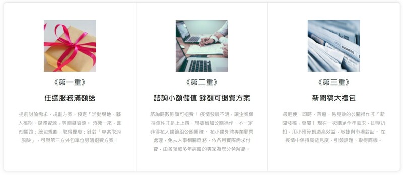 - 即日起,單次儲值「策略公關諮詢」新台幣5萬元(含)以上,即可享有「餘額退費機制」。