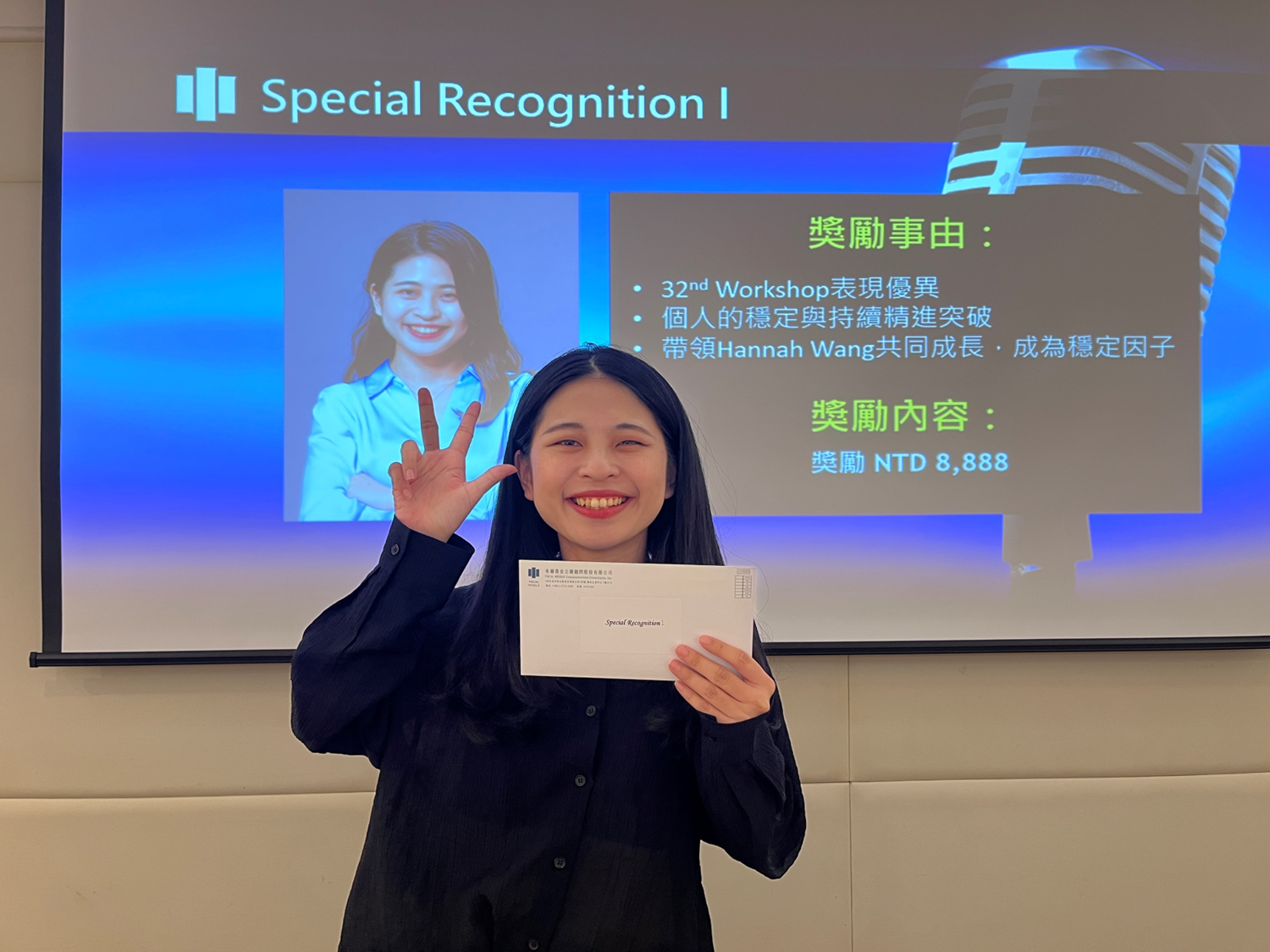 • Special Recognition-具有實質且獨有的個人與公司面向的成果,或由主管們提出夥伴們卓越的表驗,能夠分享作為全體表率的事蹟,32nd Workshop特別頒發給兩位夥伴: