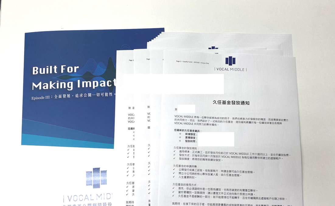 • Loyalty Fund – 又名為「久任基金」每年四月與十月,將根據每位正式夥伴的職級與績效提撥久任基金,儲存於每位夥伴的虛擬帳戶,年資雖非績效的保證,然而卻是合作互利的開端。員工是公司的資產,做得好又久的員工更是公司的最重要資產,隨著每屆 workshop 領取久任基金的人數逐漸增加,也意味著布爾喬亞為夥伴們所設計的「職涯」獲得信賴。鼓勵每一位擁已有基金的夥伴,可以在人生重要時刻提出使用,此次有三位夥伴達到使用之門檻,不限制用途與形式皆可使用基金,也有三位預計可在下一次達到門檻。