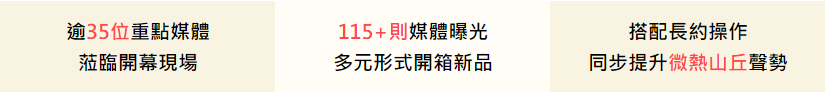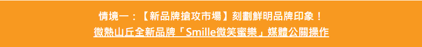 爬梳品牌優勢 :本次透過梳理雙品牌間的脈絡發展,槓桿微熱山丘既有的形象資產與市場認知,並結合前期對品牌故事、產品研發完整掌握,融入Smille「外帶便攜」、「日常甜點」、「水果無限可能」等品牌識別象徵,凸顯出全新品牌的突破性與亮點,亦有效建立媒體記憶點與報導意願。