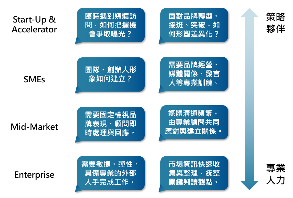 越偏向初期企業,會需要更多關於「策略」擬定上的建議,但對於中大型企業而言,快速、敏捷、彈性的「專業人力」,也是策略公關諮詢的常見使用方法之一!