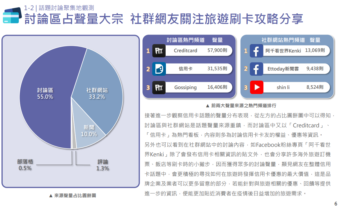 觀察信用卡話題的聲量分布,我們可以發現討論信用卡相關話題大多集中於特定的討論區(55%)、以及社群網站(33%),另外也能看到幾個主要的KOL在這些議題的討論上佔有很大的影響力。因此在進入宣傳操作以前,企業應該優先盤點利益關係人,辨別潛在受眾與目標客群的溝通管道,集中資源創造話題,讓品牌和產品獲得更高聲量。