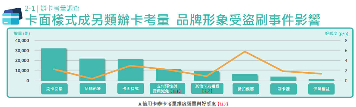 OpView蒐集了各大討論區、社群網站、新聞等資料,透過聲量及好感度的分析,了解消費者在辦卡時的考量要素與好感度,進而歸納出「刷卡回饋」和「品牌形象」是消費者最關注的兩個重點。針對以上描述性資料(Information),我們可以進一步發展出觀點(Insight):