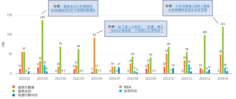 從各家近一年的聲量趨勢來看,可以觀察到關於雇主品牌的討論大多集中在三月及年底兩個高峰。分別對應到大學的求職季以及年末轉職潮。然而在話題高峰的時間點之外,企業仍然可以透過自發性地創造話題,達到出乎意料的成效。例如IKEA在去年六月與餐飲業者合作,專門針對「北漂青年」溝通,在其他企業聲量較低的時候,成為最吸睛的焦點。