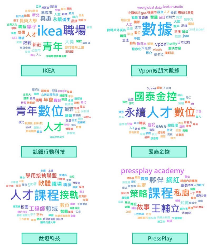 透過各家文字雲的比較,我們能夠看出不同企業品牌調性的差異及經營重點。例如IKEA在雇主形象的經營上除了常見以青年為溝通對象外,更擴大溝通僑生、銀髮族等身分,打造多元共榮的職場環境,同時也常在「幸福企業」討論中被提及。