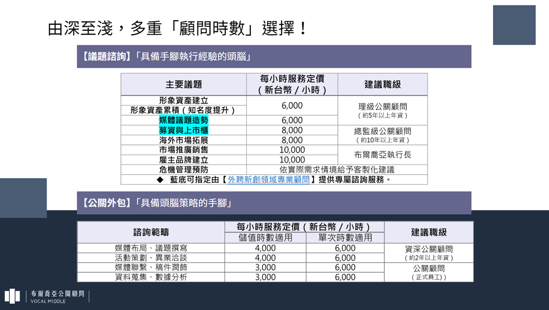 顧問時數的應用範圍包含「具備手腳執行經驗的頭腦」、與「具備頭腦策略的專業手腳」:
