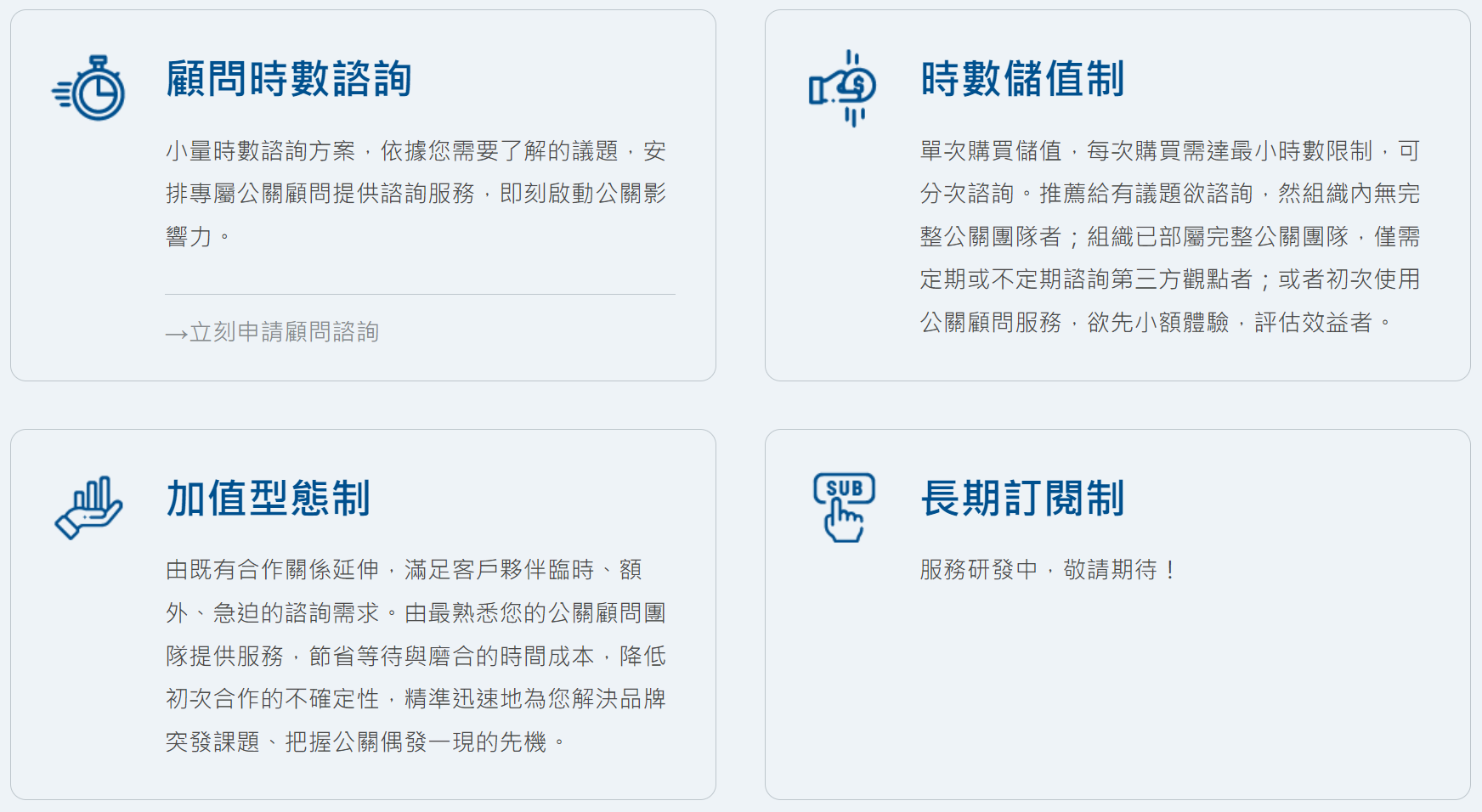 三、加值型態制:在既有合作之上,需要我們的時候,我們都在!依據實際需求,以時數計價實報實銷,讓企業即時、快速的獲得公關顧問服務。