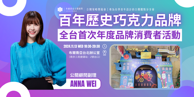 本次邀請布爾喬亞專擅經營「巨型、中大型企業」以及「生活品味與個人增值」領域的公關顧問副理 Anna Wei,開箱擁有百年歷史、享譽全球的比利時皇室御用巧克力品牌-GODIVA 於去年聖誕節首次在台盛大舉辦年度消費者活動的精選案例!歡迎大三以上在學生與三年以下相關經驗工作者報名參加!