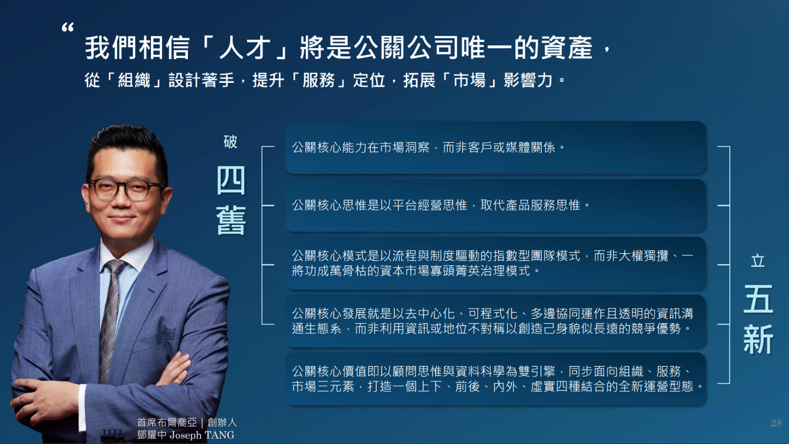 從「人才」說起,我們的發展,從公司以及個人,面對市場的變數,一切沿自於Joseph針對產業所提出的破四舊、立五新,同時也說明了布爾喬亞要成為什麼、成就什麼,更是吸引更多人才加入公關產業的由來之一﹕