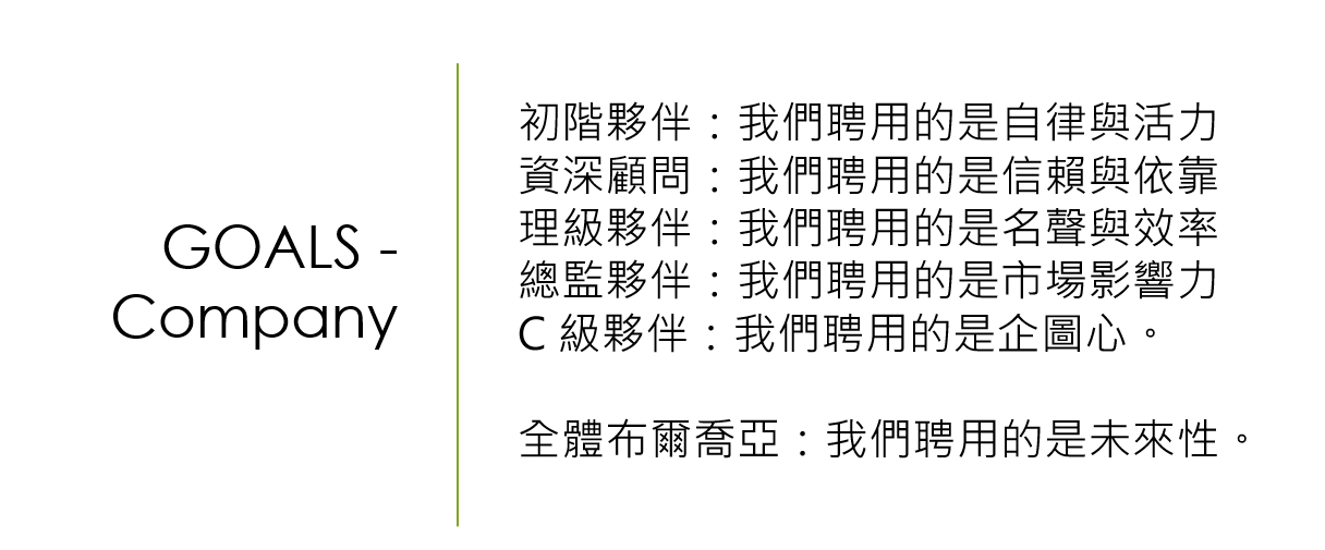 以上為部份針對內部養成的方式,讓布爾喬亞的初階夥伴們可更快更有把握地面對市場,而累積到2年以上的顧問們可以在某些服務或產業領域上獨當一面,甚至在個人發展角色上取得更佳的發展路徑。