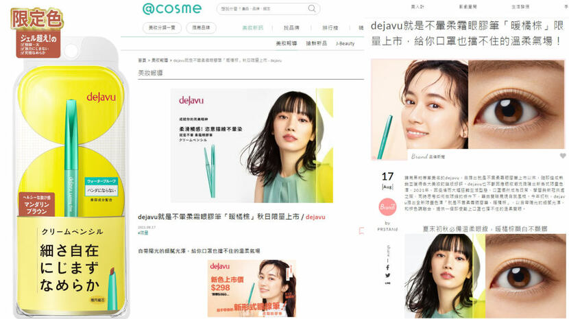 日本開架彩妝品牌dejavu,於今年初秋推出全新限量色澤「就是不暈柔霜眼膠筆-暖橘棕」,藉由媒體溝通強化產品不易暈染、新色溫柔顯白的特色,使限量色新品在短期內獲得快速曝光,累積使用者反饋進而提高消費者購買意願。