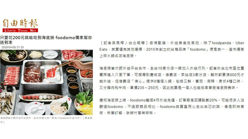 發稿正逢新型冠狀病毒疫情蔓延之時,媒體公關市場充斥各類「防疫商機」訊息,訊息海量之際,本專案關鍵目標為如何持續炒熱「宅經濟」話題,並展現《foodomo》品牌異業合作之企圖與布局,因此善用海底撈獨家合作、亮點加強等議題精準包裝,吸引媒體並開啟話題,進一步在媒體高度關注美食外送市場期間,藉機搶占媒體聲量。