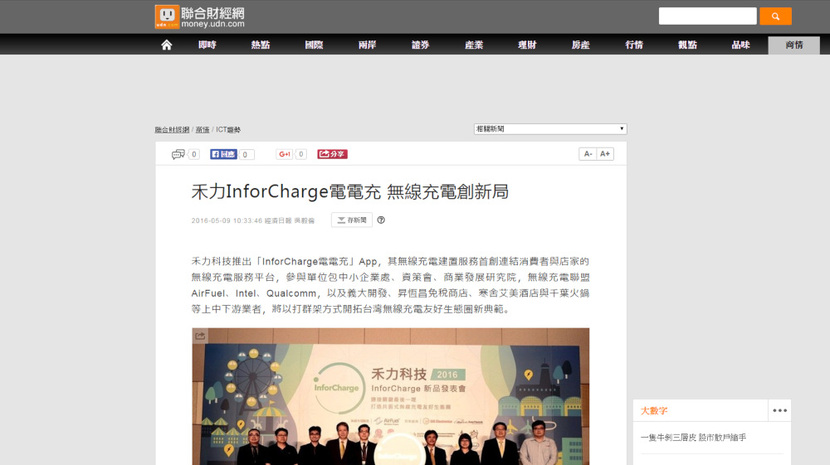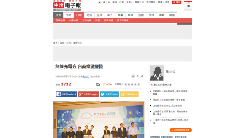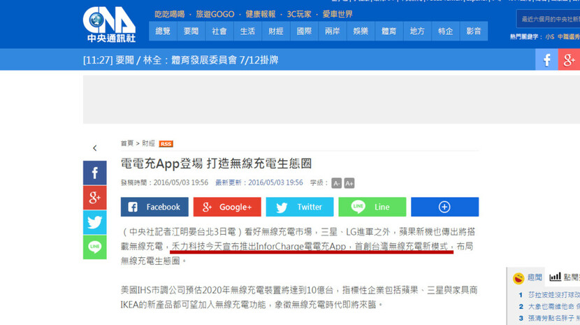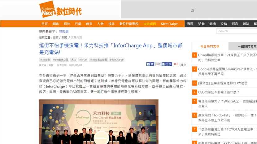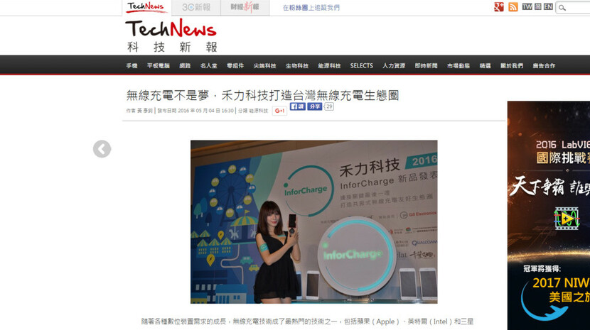 中央通訊社 / 電電充App登場 打造無線充電生態圈 中時電子報 / 無線充電夯 台商搶灘登陸 聯合財經網 / 禾力InforCharge電電充 無線充電創新局 數位時代 / 逛街不怕手機沒電!禾力科技推「InforCharge App」整個城市都是充電站! TechNews / 無線充電不是夢,禾力科技打造台灣無線充電生態圈