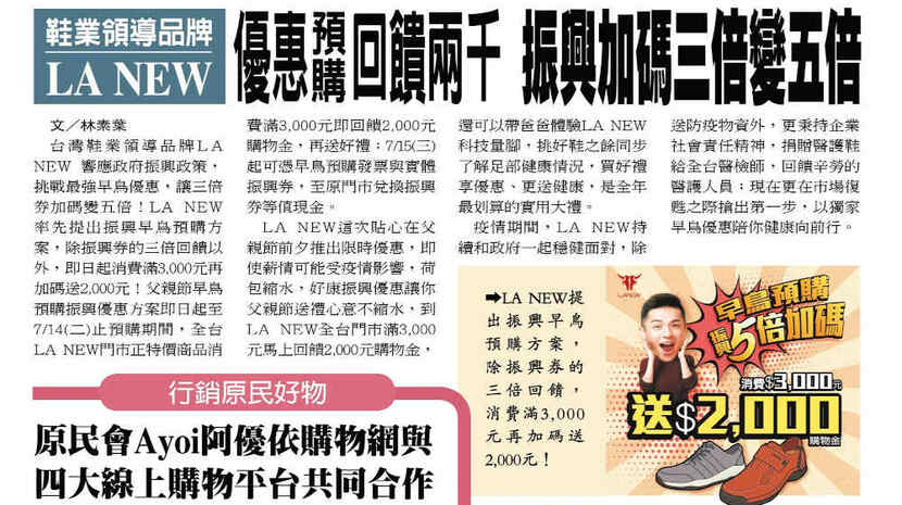 本次 LA NEW 結合疫情相關時事議題,於後疫情時代迅速響應政府振興經濟方案,提出業界首發振興券優惠;同時串聯品牌行動,包含今年五月母親節的防疫物資贈送、與台灣醫檢產業工會合作的醫護鞋捐贈計畫等,向市場傳遞品牌在疫情期間與政府和社會同行的活躍形象;並延續溝通 2019 LA NEW 2.0 關注全民足部需求、耕耘足健康領域的專家定位。