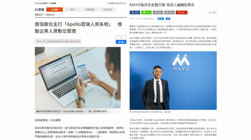 本次新聞稿發稿,結合趨勢並以MAYO推動「人資轉型革命」為切點,搭配產品及案例亮點,成功吸引關鍵媒體如經濟日報、工商時報、中央社、ETtoday等媒體露出。此次媒體曝光共創造20+則露出,以及四百多萬的公關價值,亮點曝光參考: